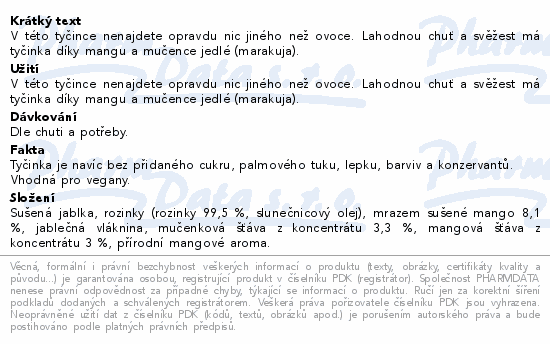 V této tyčince nenajdete opravdu nic jiného než ovoce. Lahodnou chuť a svěžest má tyčinka díky mangu a mučence jedlé (marakuja).
