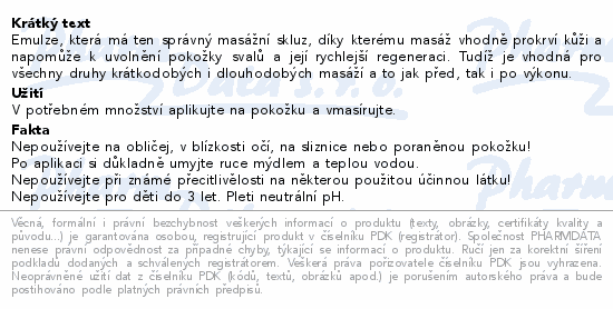Emulze, která má ten správný masážní skluz, díky kterému masáž vhodně prokrví kůži a napomůže k uvolnění pokožky svalů a její rychlejší regeneraci. Tudíž je vhodná pro všechny druhy krátkodobých i dlouhodobých masáží a to jak před, tak i po výkonu.