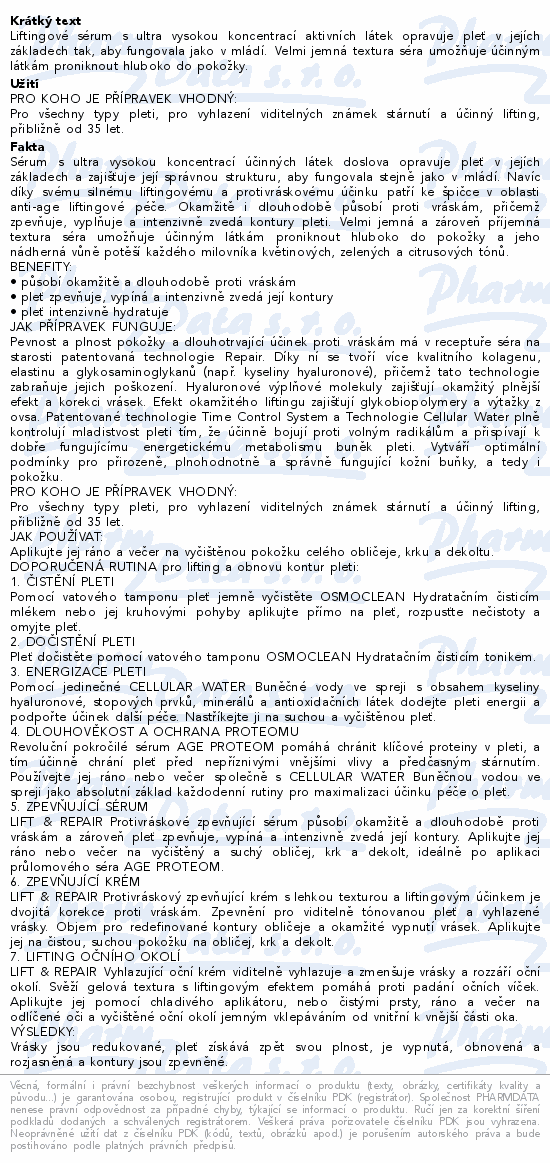 Liftingové sérum s ultra vysokou koncentrací aktivních látek opravuje pleť v jejích základech tak, aby fungovala jako v mládí. Velmi jemná textura séra umožňuje účinným látkám proniknout hluboko do pokožky.
