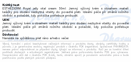 ESTHEDERM Royal jelly vital cream 50ml: Jemný výživný krém s obsahem mateří kašičky pro dodání nezbytné vitality do povadlé pleti. Ideální péče při změně ročního období a pokaždé, kdy pokožka potřebuje probudit.
