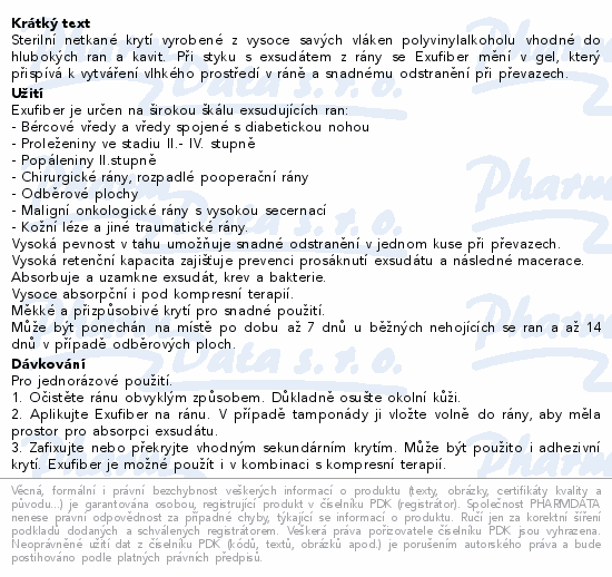 Sterilní netkané krytí vyrobené z vysoce savých vláken polyvinylalkoholu vhodné do hlubokých ran a kavit. Při styku s exsudátem z rány se Exufiber mění v gel, který přispívá k vytváření vlhkého prostředí v ráně a snadnému odstranění při převazech.