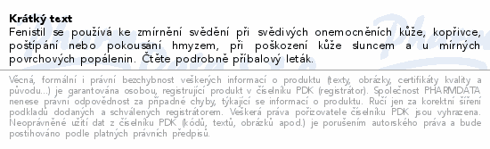 Fenistil se používá ke zmírnění svědění při svědivých onemocněních kůže, kopřivce, poštípání nebo pokousání hmyzem,...