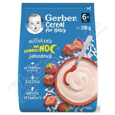 GERBER Cereal mléčná kaše jahodová Dobrou noc je kombinací vysoce kvalitní rýžové mouky, jemné chuti jahod a vitamínů, která uspokojí potřeby děťátka i jeho mlsný jazýček. Kaše je vhodná pro kojence od ukončeného 6. měsíce.