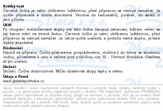 Červená čočka je velmi oblíbenou luštěninou, před přípravou se nemusí namáčet. Je rychle připravená a dobře stravitelná. Vhodná do karbanátků, polévek, do salátů či jako příloha.