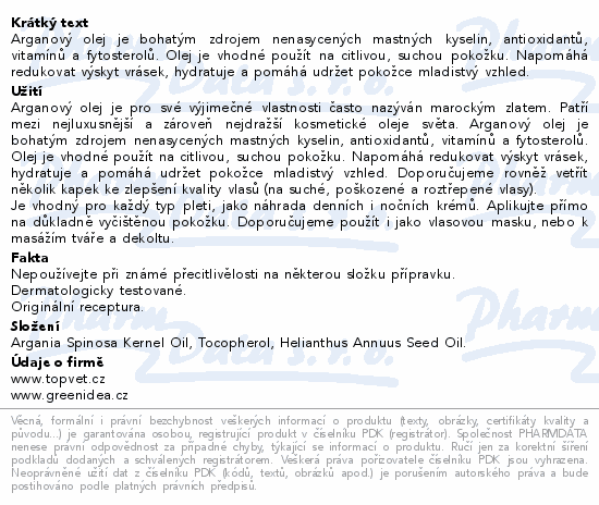 Arganový olej je bohatým zdrojem nenasycených mastných kyselin, antioxidantů, vitamínů a fytosterolů. Olej je vhodné použít na citlivou, suchou pokožku. Napomáhá redukovat výskyt vrásek, hydratuje a pomáhá udržet pokožce mladistvý vzhled.