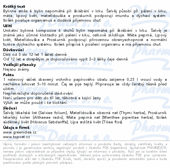 Bylinná směs 6 bylin napomáhá při škrábání v krku. Šalvěj působí při pálení v krku, máta, lipový květ, mateřídouška a proskurník podporují imunitu a dýchací systém. Ibišek posiluje organismus a dodává příjemnou chuť.