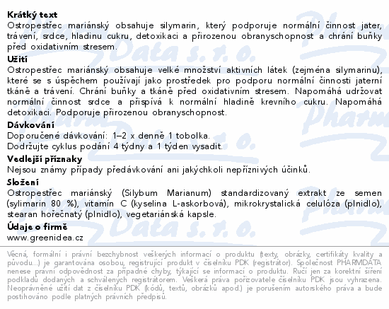 Ostropestřec mariánský obsahuje silymarin, který podporuje normální činnost jater, trávení, srdce, hladinu cukru, detoxikaci a přirozenou obranyschopnost a chrání buňky před oxidativním stresem.