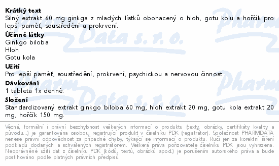 Silný extrakt 60 mg ginkga z mladých lístků obohacený o hloh, gotu kolu a hořčík pro lepší paměť, soustředění a prokrvení.