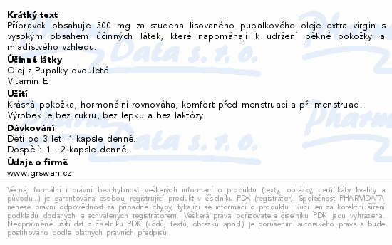 Přípravek obsahuje 500 mg za studena lisovaného pupalkového oleje extra virgin s vysokým obsahem účinných látek, které napomáhají k udržení pěkné pokožky a mladistvého vzhledu.