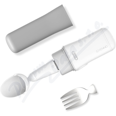 Chytrá technologie pro zlepšení kvality života pro osoby s Parkinsonovou nemocí, stravovací pomůcka s adaptivní stabilizační technologií, vyměnitelný nástavec (lžíce, vidlička)