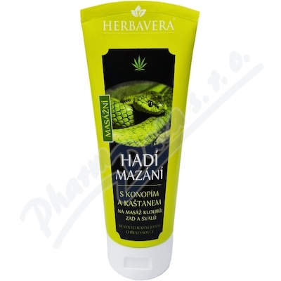 Hadí mazání s konopím obsahuje tripeptid syntetického jedu chřestýšovce pro uvolnění svalů. Dále obsahuje kaštan, kostival,...