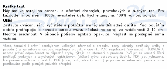 Náplast ve spreji na ochranu a ošetření drobných, povrchových a suchých ran. Pro každodenní poranění. 100% neviditelné krytí. Rychle zasychá. 100% volnost pohybu.