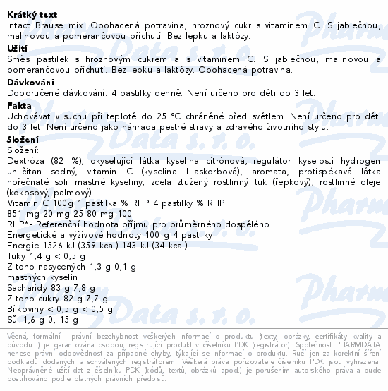 Intact Brause mix. Obohacená potravina, hroznový cukr s vitaminem C. S jablečnou, malinovou a pomerančovou příchutí. Bez lepku a laktózy.