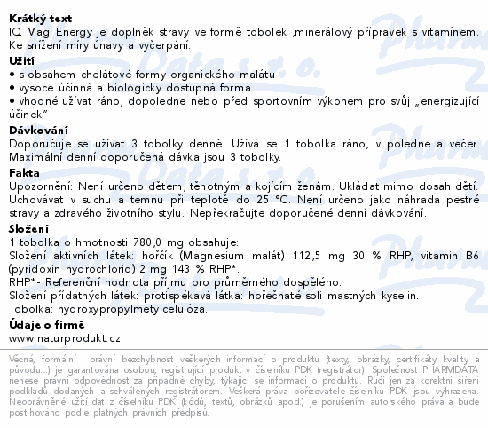 IQ Mag Energy je doplněk stravy ve formě tobolek , minerálový přípravek s vitamínem. Ke snížení míry únavy a vyčerpání.