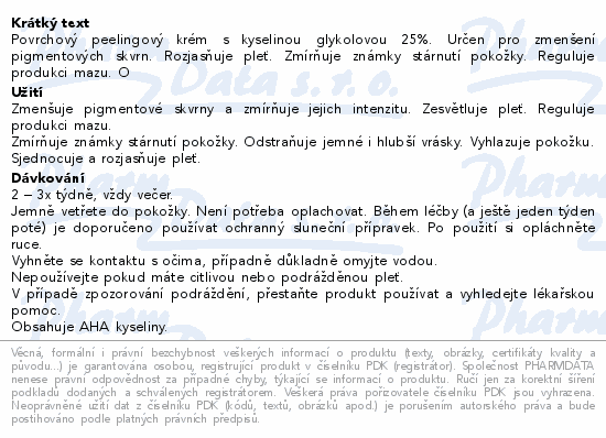 Povrchový peelingový krém s kyselinou glykolovou 25%. Určen pro zmenšení pigmentových skvrn. Rozjasňuje pleť. Zmírňuje známky stárnutí pokožky. Reguluje produkci mazu. O