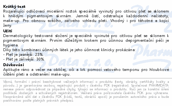 Rozjasňující odličovací micelární roztok speciálně vyvinutý pro citlivou pleť se sklonem k hnědým pigmentovým skvrnám. Jemně čistí, odstraňuje každodenní nečistoty, make-up. Pro obnovu svěžího, zářivého vzhledu pleti. Vhodný i pro těhotné a kojící ženy.