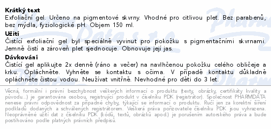 Exfoliační gel. Určeno na pigmentové skvrny. Vhodné pro citlivou pleť. Bez parabenů, bez mýdla, fyziologické pH. Objem 150 ml.