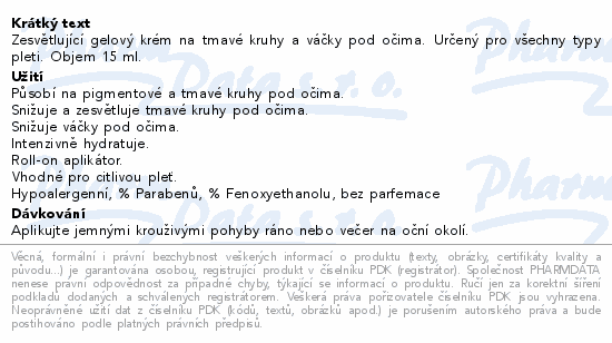 Zesvětlující gelový krém na tmavé kruhy a váčky pod očima. Určený pro všechny typy pleti. Objem 15 ml.