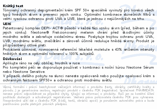 Tónovaný ochranný depigmentační krém SPF 50+ speciálně vyvinutý pro korekci všech typů hnědých skvrn a prevenci jejich vzniku. Optimální kombinace slunečních filtrů s velmi vysokou ochranou proti UVA a UVB, která je jednou z nejúčinnějších na trhu.