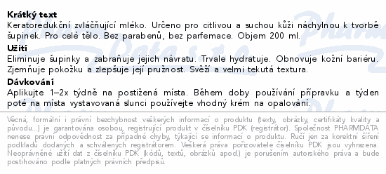 Keratoredukční zvláčňující mléko. Určeno pro citlivou a suchou kůži náchylnou k tvorbě šupinek. Pro celé tělo. Bez parabenů, bez parfemace. Objem 200 ml.
