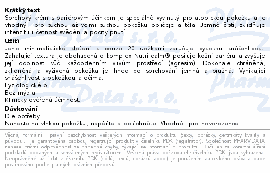 Sprchový krém s bariérovým účinkem je speciálně vyvinutý pro atopickou pokožku a je vhodný i pro suchou až velmi suchou pokožku obličeje a těla. Jemně čistí, zklidňuje intenzitu i četnost svědění a pocity pnutí.