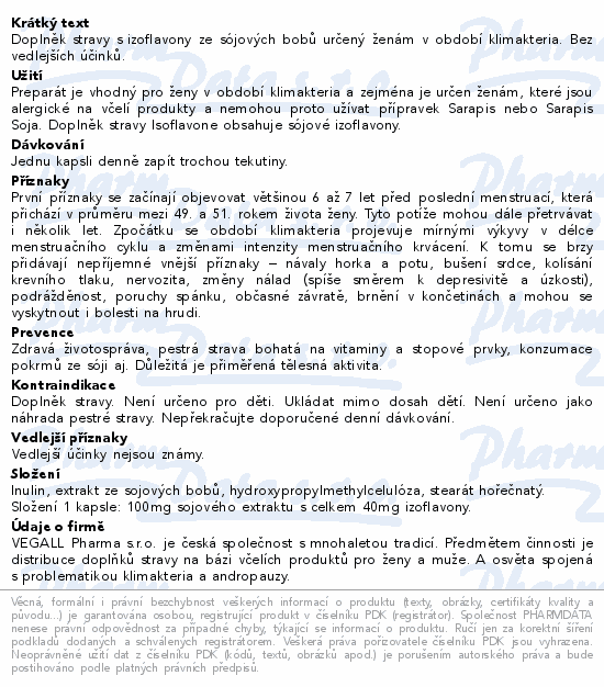 Doplněk stravy s izoflavony ze sójových bobů určený ženám v období klimakteria. Bez vedlejších účinků.