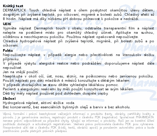 DERMAPLICK Touch chladivá náplast s cílem poskytnot okamžitou úlevu dětem, dospělým při zvýšené teplotě, po očkovaní, migréně a bolesti zubů. Chladivý efekt až 8 hodin. Náplast má díky nízkému pH dobrou přilnavost k pokožce a nedráždí.