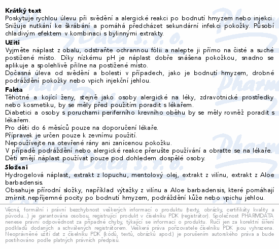 Poskytuje rychlou úlevu při svědění a alergické reakci po bodnutí hmyzem nebo injekci. Snižuje nutkání ke škrábání a pomáhá předcházet sekundární infekci pokožky. Působí chladivým efektem v kombinaci s bylinnými extrakty.
