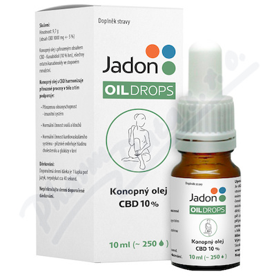 Doplněk stravy Jadon Oil Drops je konopný olej s obsahem CBD 10 %. Přirozená obranyschopnost, imunitní systém, normální činnost svalů a kloubů, normální činnost kardiovaskulárního systému a příznivě ovlivňuje hladinu cholesterolu.