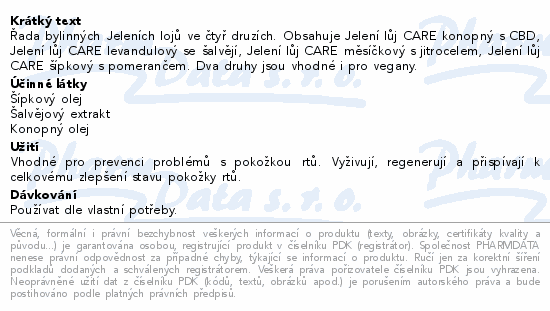 Řada bylinných Jeleních lojů ve čtyř druzích. Obsahuje Jelení lůj CARE konopný s CBD, Jelení lůj CARE levandulový se šalvějí, Jelení lůj CARE měsíčkový s jitrocelem, Jelení lůj CARE šípkový s pomerančem. Dva druhy jsou vhodné i pro vegany.