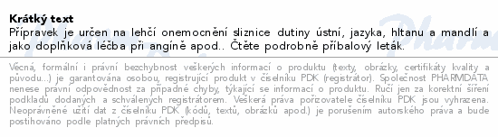 Přípravek je určen na lehčí onemocnění sliznice dutiny ústní, jazyka, hltanu a mandlí a jako doplňková léčba při angíně...