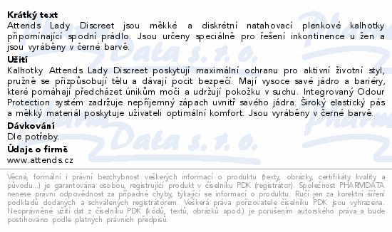 Attends Lady Discreet jsou měkké a diskrétní natahovací plenkové kalhotky připomínající spodní prádlo. Jsou určeny speciálně pro řešení inkontinence u žen a jsou vyráběny v černé barvě.