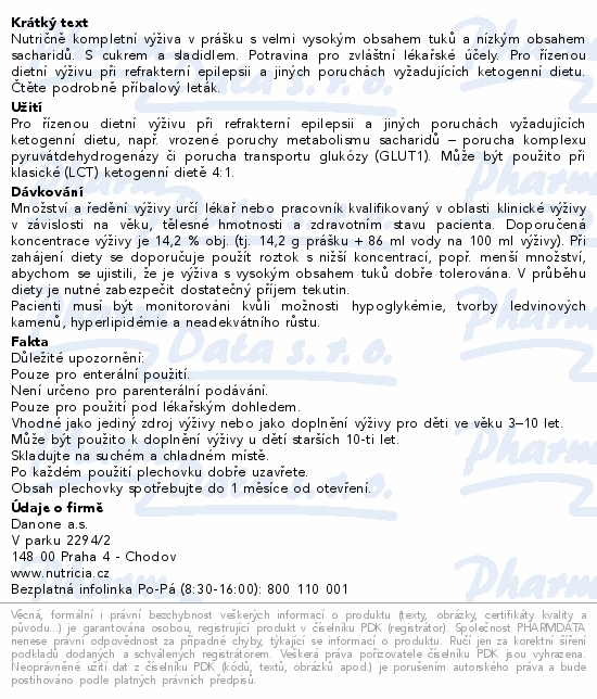 Nutričně kompletní výživa v prášku s velmi vysokým obsahem tuků a nízkým obsahem sacharidů. S cukrem a sladidlem. Potravina pro zvláštní lékařské účely. Pro řízenou dietní výživu při refrakterní epilepsii a jiných poruchách vyžadujících ketogenní dietu. Čtěte pozorně příbalový leták.