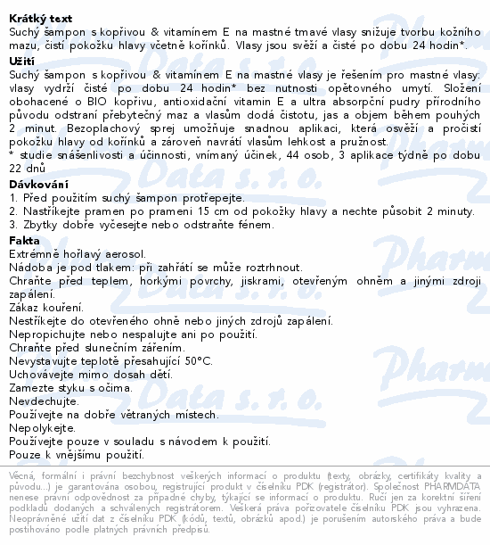 Suchý šampon s kopřivou & vitamínem E na mastné tmavé vlasy snižuje tvorbu kožního mazu, čistí pokožku hlavy včetně kořínků. Vlasy jsou svěží a čisté po dobu 24 hodin*.
