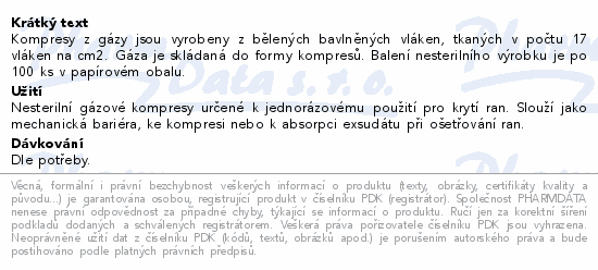 Kompresy z gázy jsou vyrobeny z bělených bavlněných vláken, tkaných v počtu 17 vláken na cm2. Gáza je skládaná do formy kompresů. Balení nesterilního výrobku je po 100 ks v papírovém obalu.