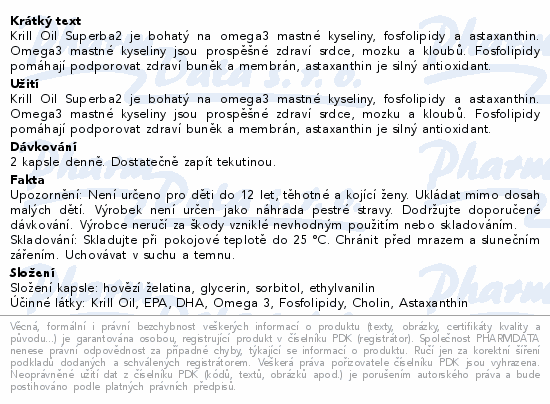 Krill Oil Superba2 je bohatý na omega3 mastné kyseliny, fosfolipidy a astaxanthin. Omega3 mastné kyseliny jsou prospěšné zdraví srdce, mozku a kloubů. Fosfolipidy pomáhají podporovat zdraví buněk a membrán, astaxanthin je silný antioxidant.