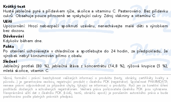 Husté jablečné pyré s přídavkem rýže, skořice a vitaminu C. Pasterováno. Bez přídavku cukrů. Obsahuje pouze přirozeně se vyskytující cukry. Zdroj vlákniny a vitamínu C.