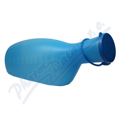 Modrá láhev na moč s uzávěrem v PE sáčku - plastová láhev o objemu 1000ml, s dělenou stupnicí po 50ml, opatřená modrým uzávěrem. Je určena zejména špatně pohyblivým nebo nepohyblivým pacientům (mužům) k zachycení jednotlivých porcí moči.