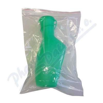 Zelená láhev na moč s uzávěrem v PE sáčku - plastová láhev o objemu 1000ml s dělenou stupnicí po 50ml, opatřená zeleným uzávěrem. Je určena zejména špatně pohyblivým nebo nepohyblivým pacientům (mužům), k zachycení jednotlivých porcí moči.