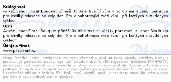 Aviváž Lenor Floral Bouquet přináší 3x déle trvající vůni v porovnání s Lenor Sensitive pro chvilky relaxace po celý den. Pro dlouhotrvající svěží vůni i při krátkých a studených cyklech.