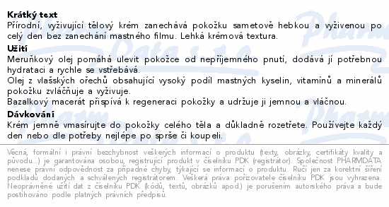 Přírodní, vyživující tělový krém zanechává pokožku sametově hebkou a vyživenou po celý den bez zanechání mastného filmu. Lehká krémová textura.
