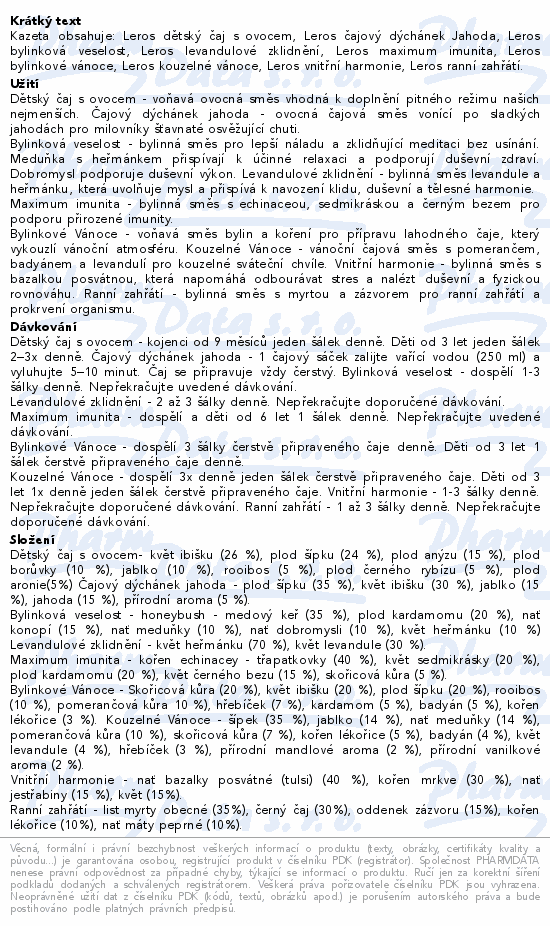 Kazeta obsahuje: Leros dětský čaj s ovocem, Leros čajový dýchánek Jahoda, Leros bylinková veselost, Leros levandulové zklidnění, Leros maximum imunita, Leros bylinkové vánoce, Leros kouzelné vánoce, Leros vnitřní harmonie, Leros ranní zahřátí.