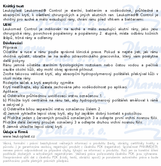 Leukoplast Leukomed® Control je sterilní, bakteriím a voděodolné, průhledné a absorpční krytí, k ošetření chirurgických a jiných akutních ran. Leukomed® Control je vhodný pro suché a málo exsudující rány, chrání ránu před vlhkem a bakteriemi.