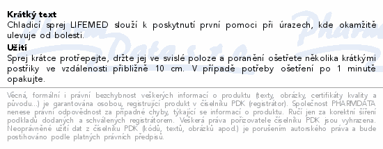 Chladicí sprej LIFEMED slouží k poskytnutí první pomoci při úrazech, kde okamžitě ulevuje od bolesti.