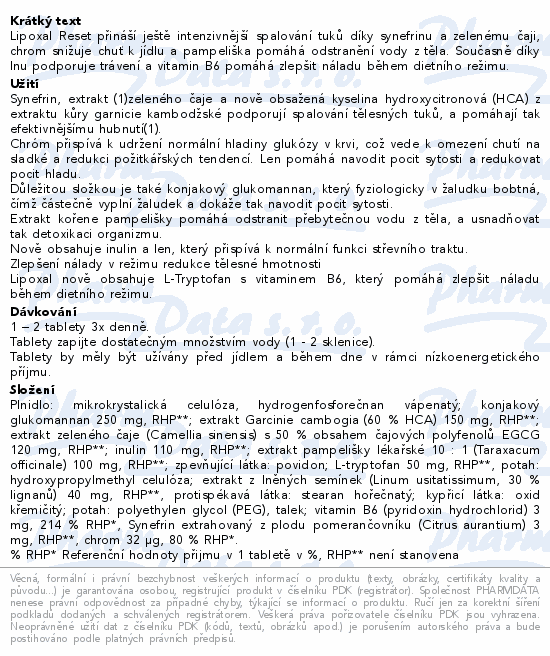 Lipoxal Reset přináší ještě intenzivnější spalování tuků díky synefrinu a zelenému čaji, chrom snižuje chuť k jídlu a pampeliška pomáhá odstranění vody z těla. Současně díky lnu podporuje trávení a vitamin B6 pomáhá zlepšit náladu během dietního režimu.