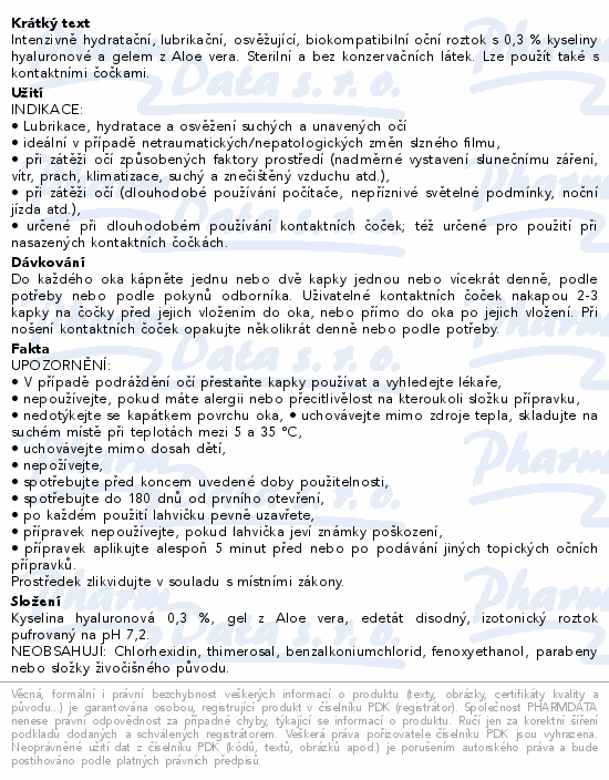 Intenzivně hydratační, lubrikační, osvěžující, biokompatibilní oční roztok s 0, 3 % kyseliny hyaluronové a gelem z Aloe vera. Sterilní a bez konzervačních látek. Lze použít také s kontaktními čočkami.
