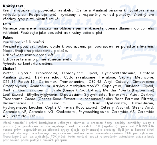 Krém s výtažkem z pupečníku asijského (Centella Asiatica) přispívá k hydratovanému vzhledu pleti. Podporuje svěží, vyvážený a rozjasněný vzhled pokožky. Vhodný pro všechny typy pleti, včetně citlivé.