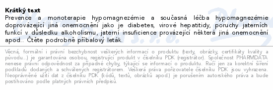 Prevence a monoterapie hypomagnezémie a současná léčba hypomagnezémie doprovázející jiná onemocnění jako je diabetes, virové hepatitidy, poruchy jaterních funkcí v důsledku alkoholismu, jaterní insuficience provázející některá jiná onemocnění apod.. Čtěte pozorně příbalový leták.