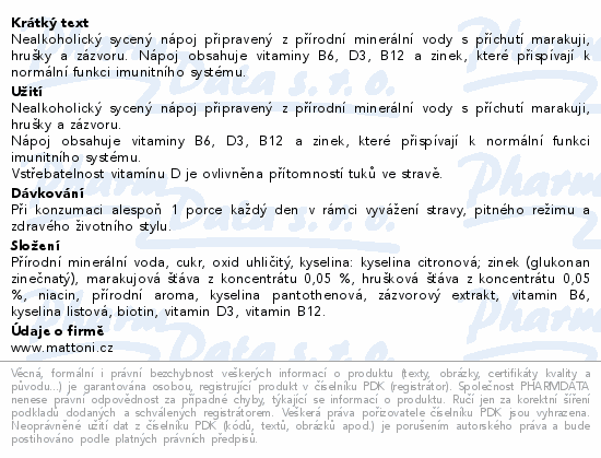 Nealkoholický sycený nápoj připravený z přírodní minerální vody s příchutí marakuji, hrušky a zázvoru. Nápoj obsahuje vitaminy B6, D3, B12 a zinek, které přispívají k normální funkci imunitního systému.