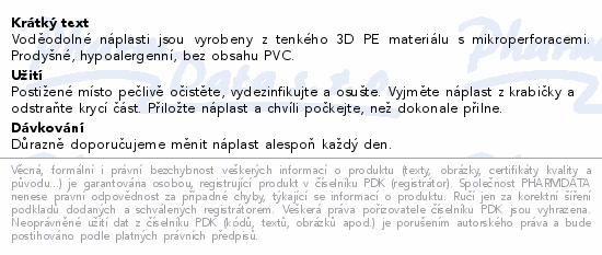 Voděodolné náplasti jsou vyrobeny z tenkého 3D PE materiálu s mikroperforacemi. Prodyšné, hypoalergenní, bez obsahu PVC.